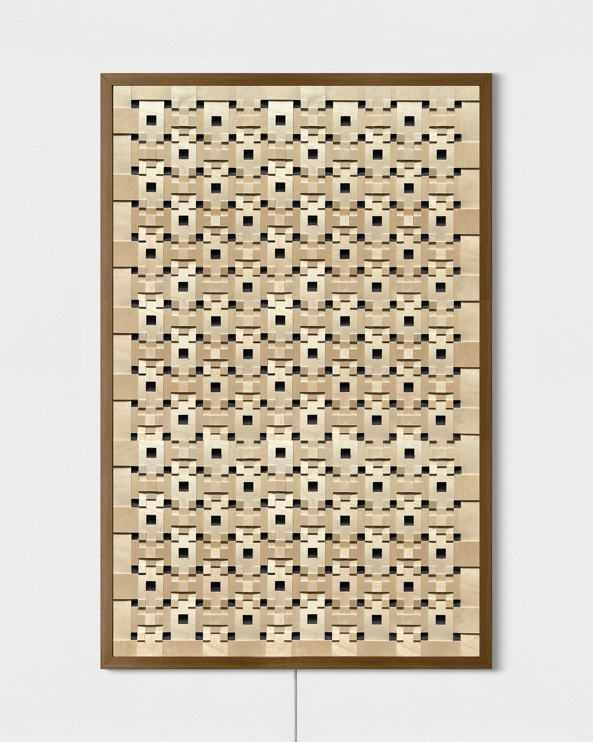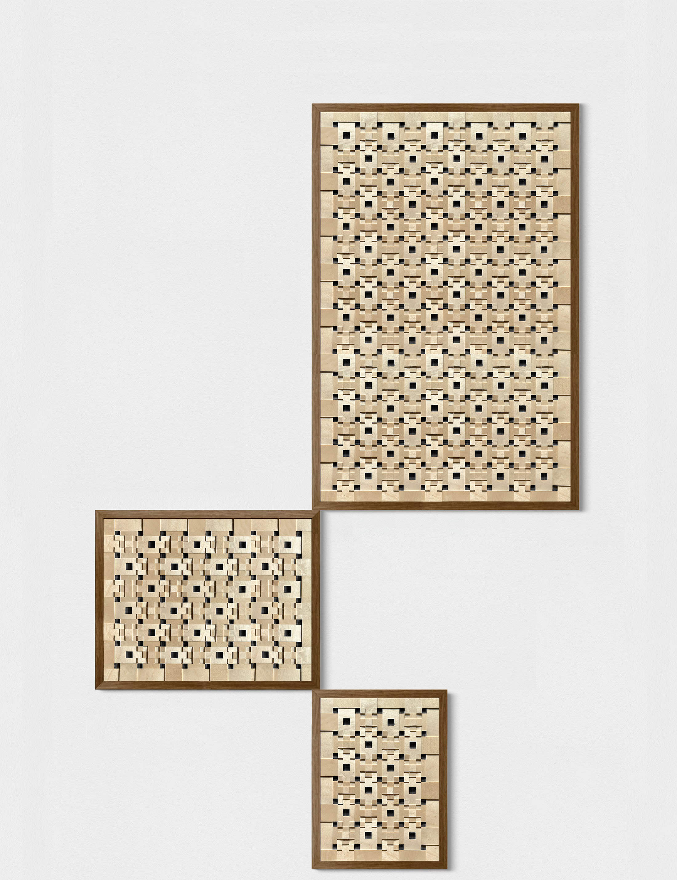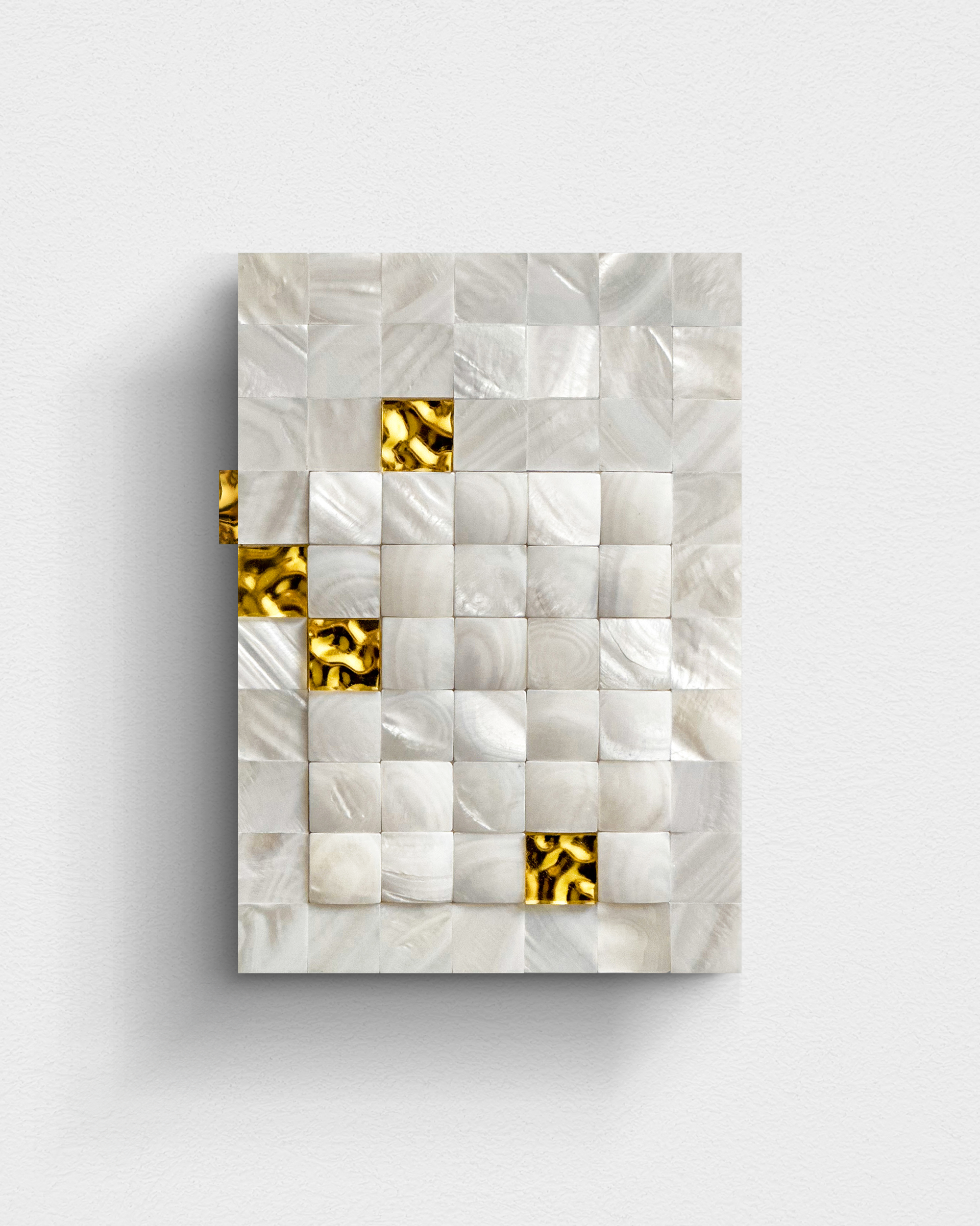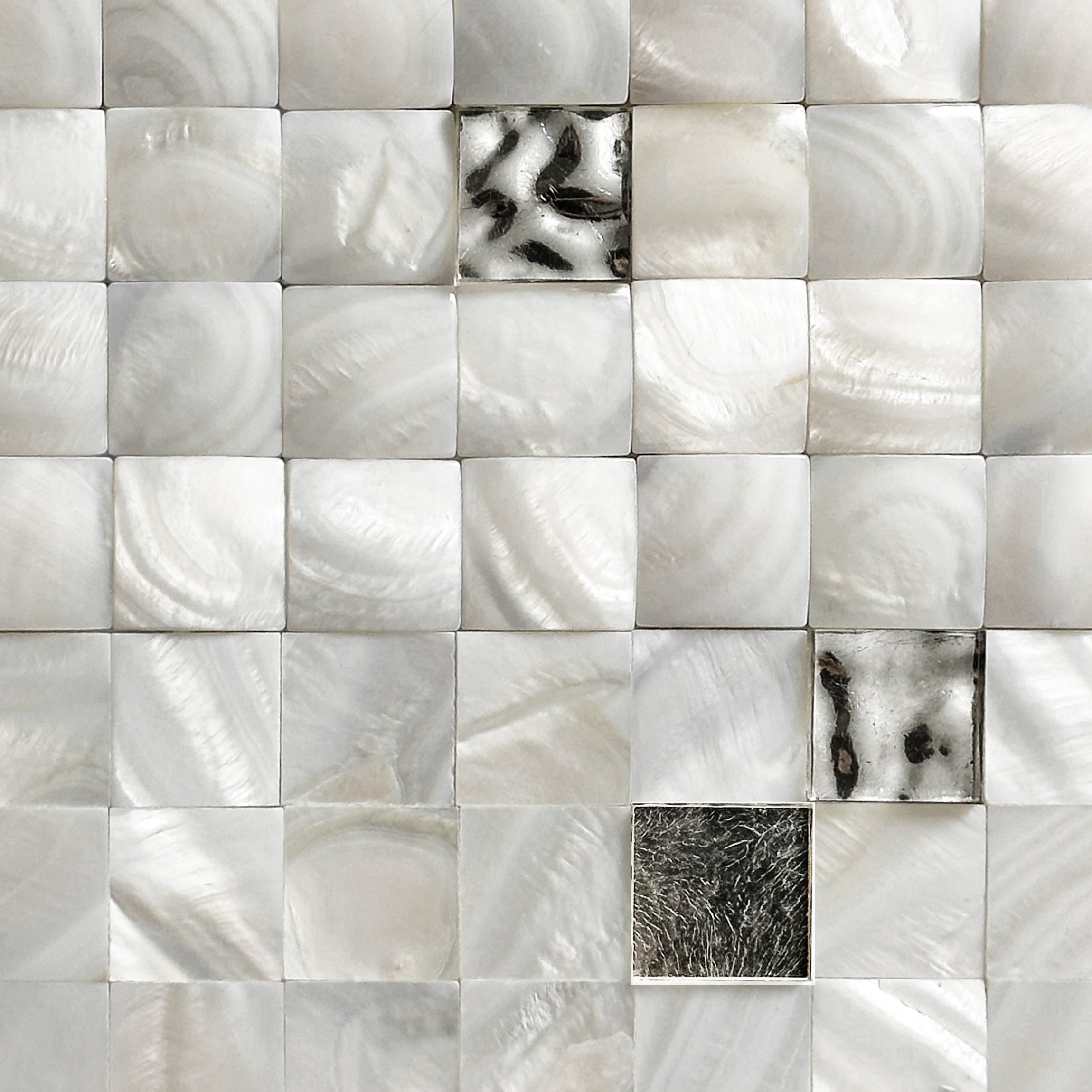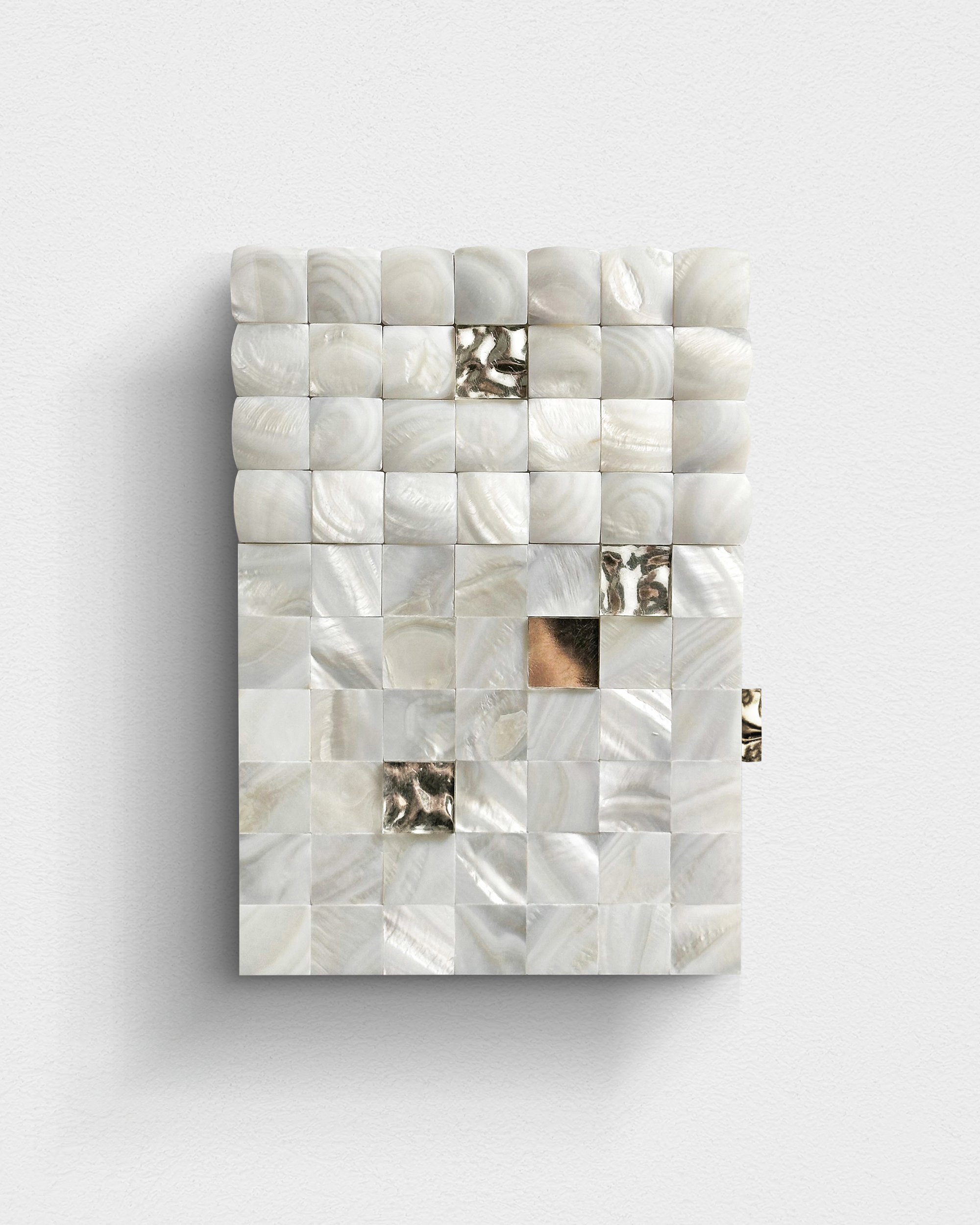 These pieces arrange fragments of snow white mother-of-pearl into a measured grid, where flat and softly convex surfaces gather and fold light. The surface shifts gently as the viewer moves, revealing a slow, tidal shimmer held within strict geometry.