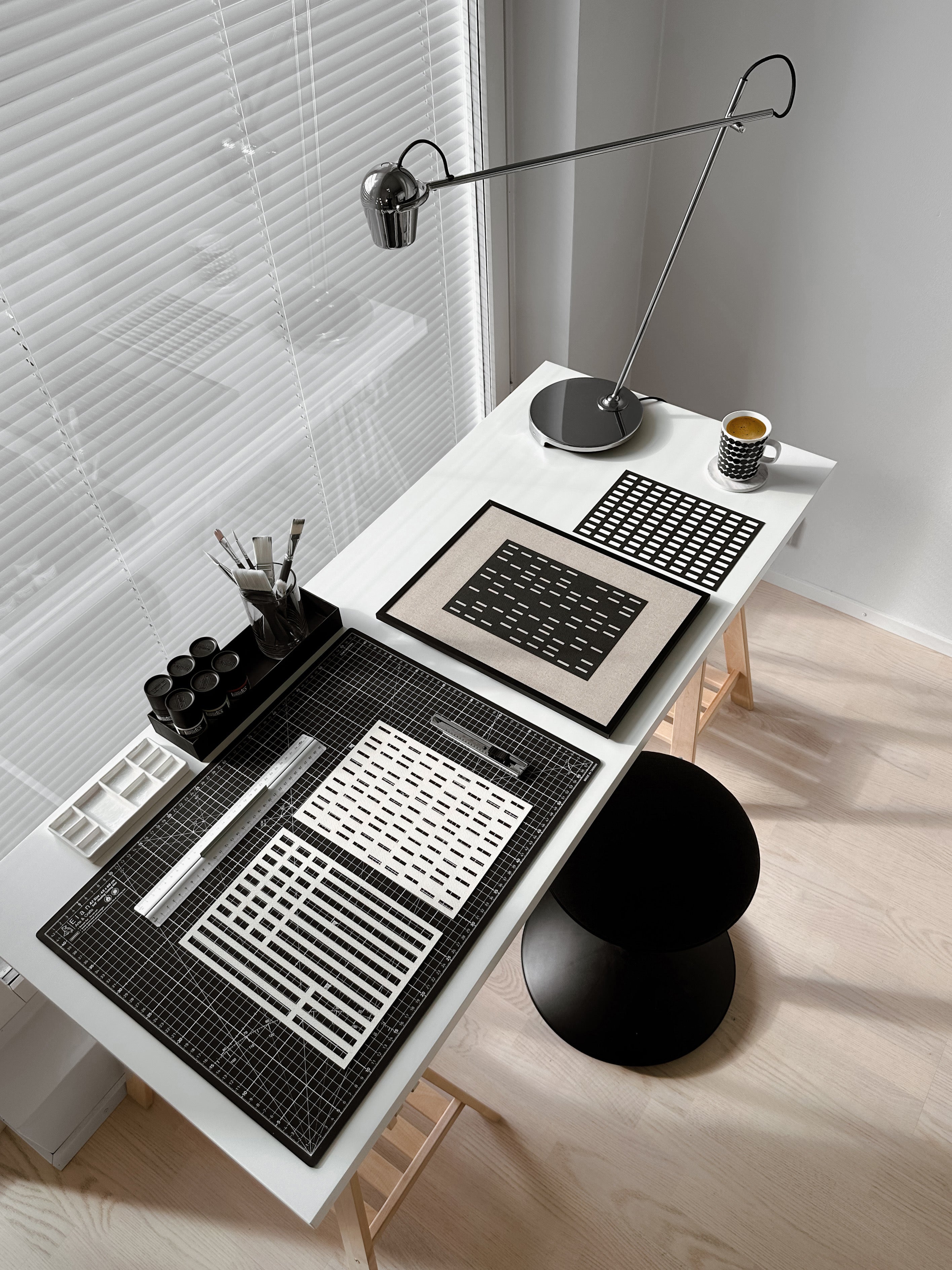 This series of paper relief artworks explores the delicate interplay of light, texture, and reflection. Crafted with precision, each piece combines premium cotton paper with sustainably sourced acrylic glass mirrors. Layers of black and white paper are arranged to form a rhythmic, monochromatic grid. The mirrored inserts catch and scatter light, guiding the viewer’s gaze to different points within the composition. This interplay transforms the seemingly static grid into something dynamic — alive with shifting light and perspective, revealing new details with every glance.