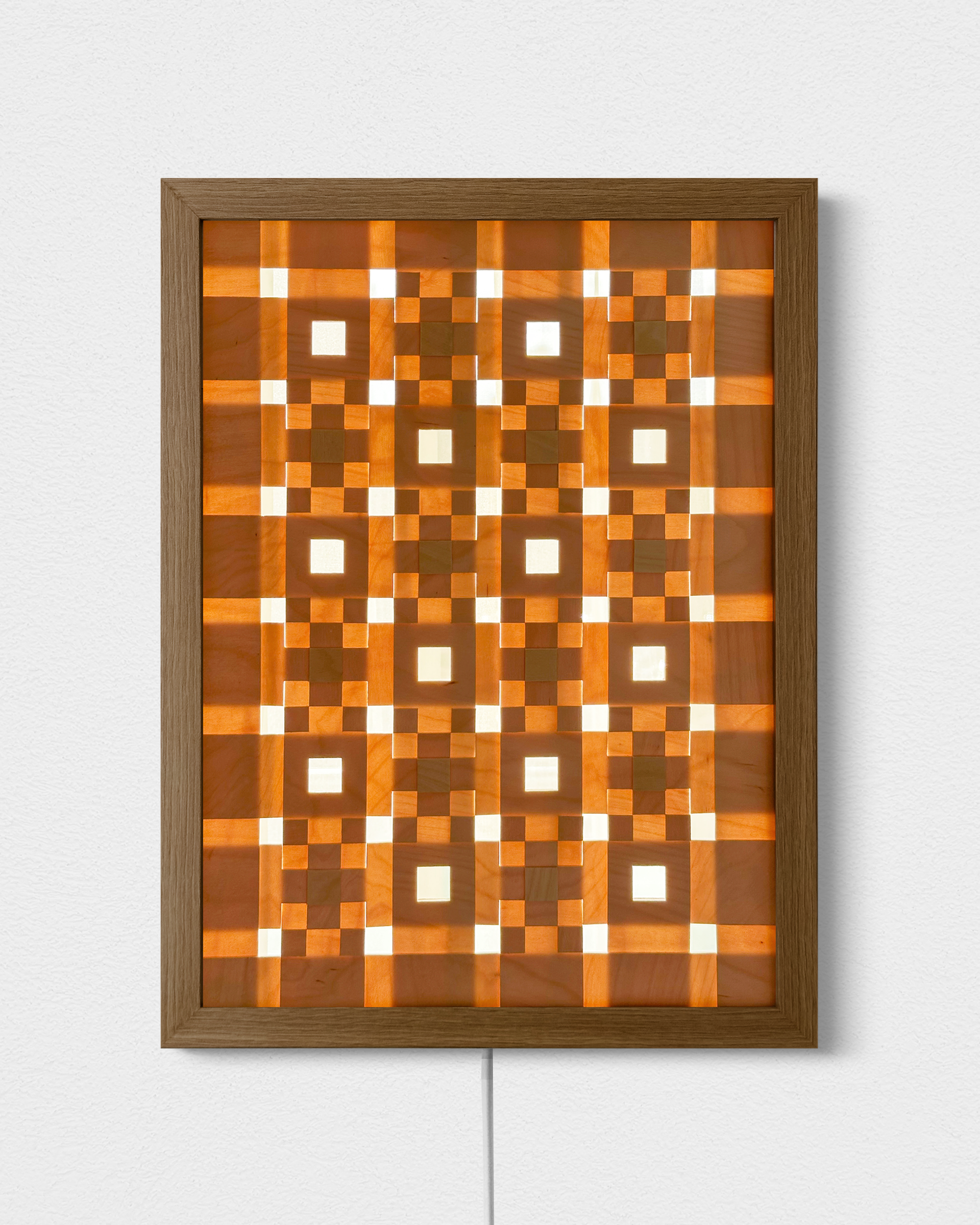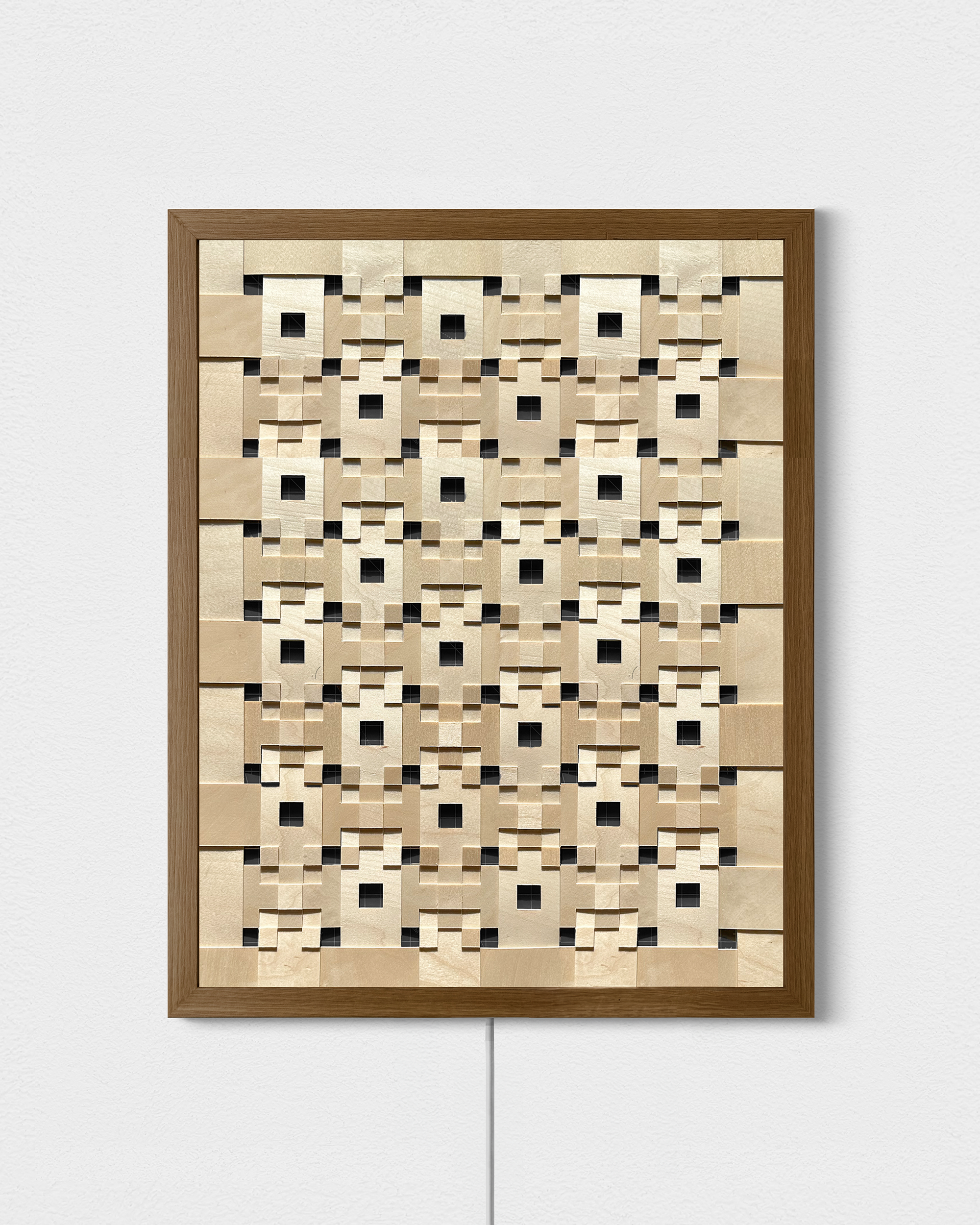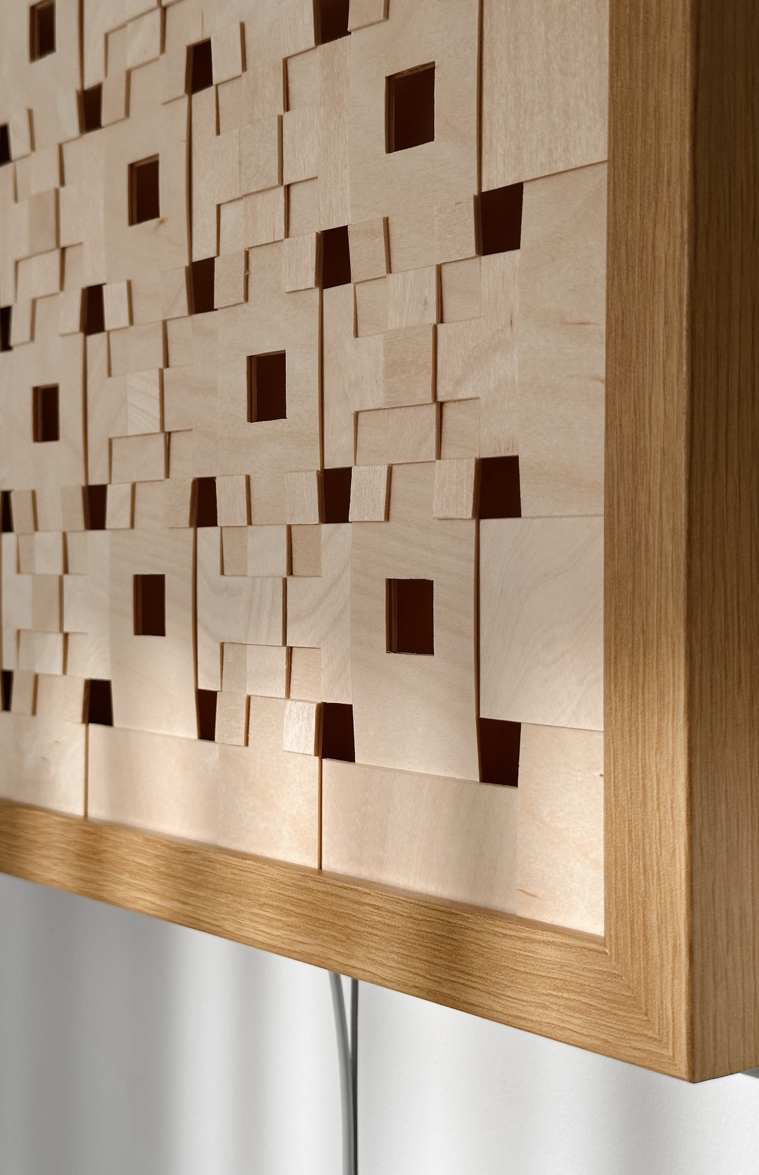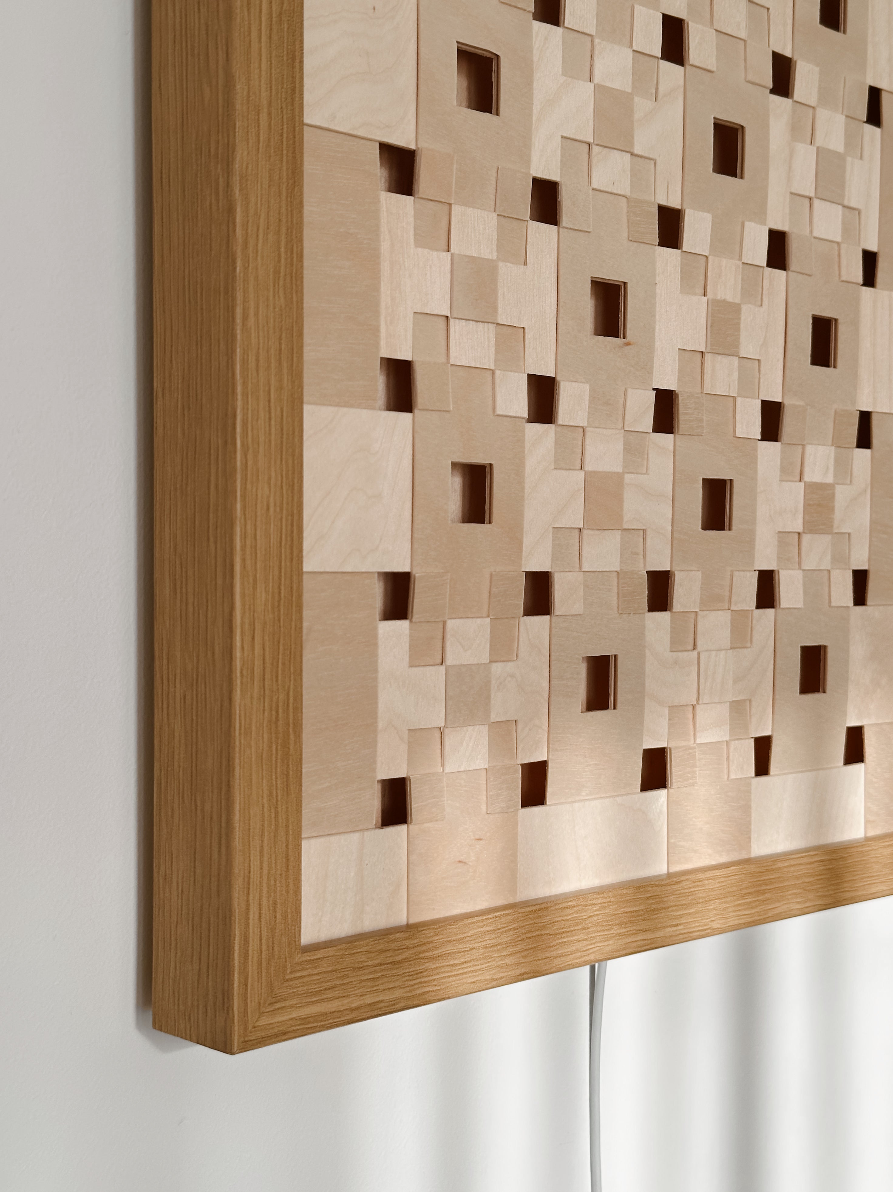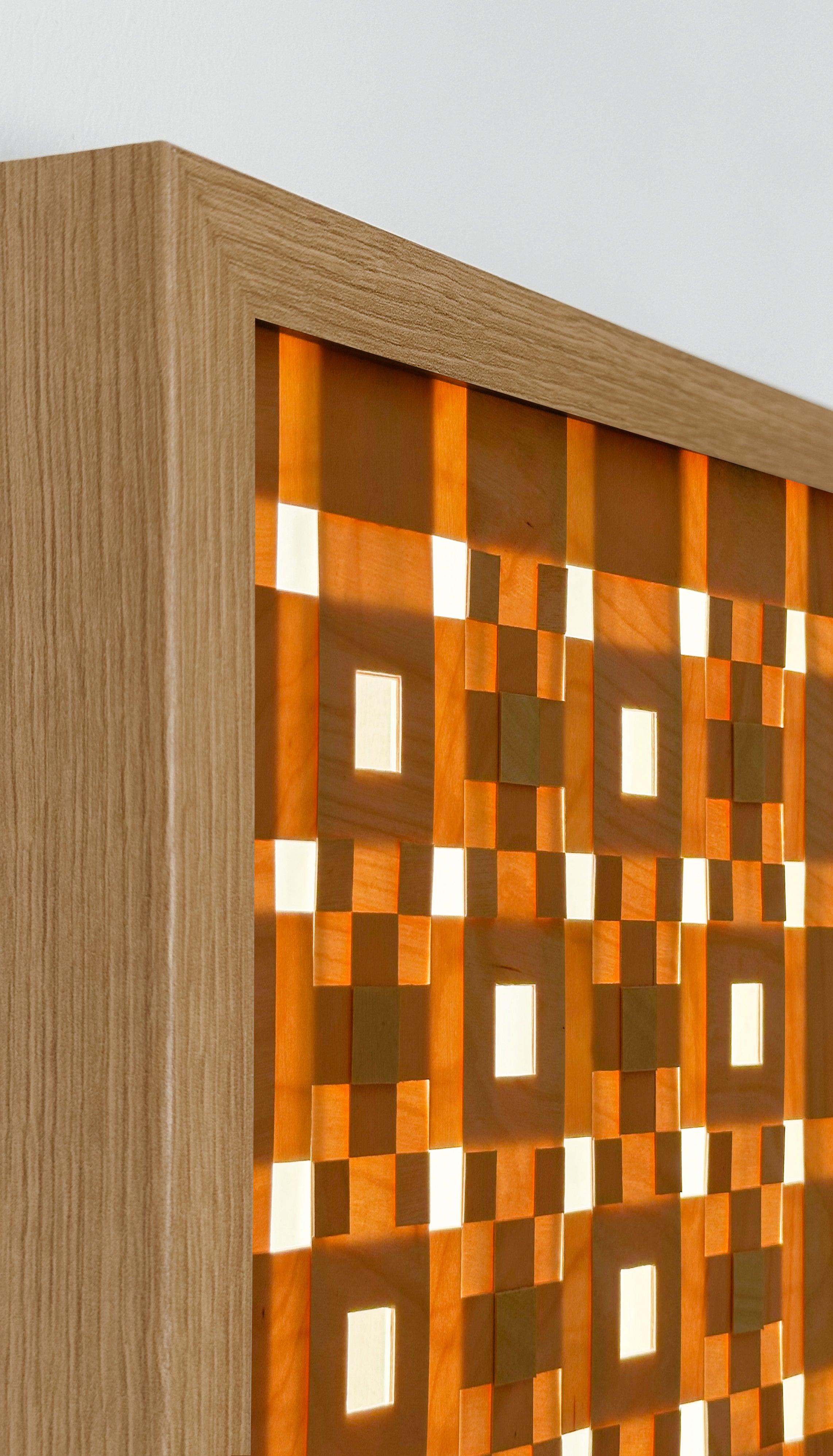 A soft LED light behind the panel brings the structure to life, revealing how the wood filters and shapes the glow. The piece stays understated: balanced between craft and clarity, warm material and modern technique. It is designed to offer a calm point of focus, inviting light to become part of the texture rather than something added on top.