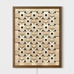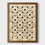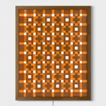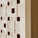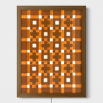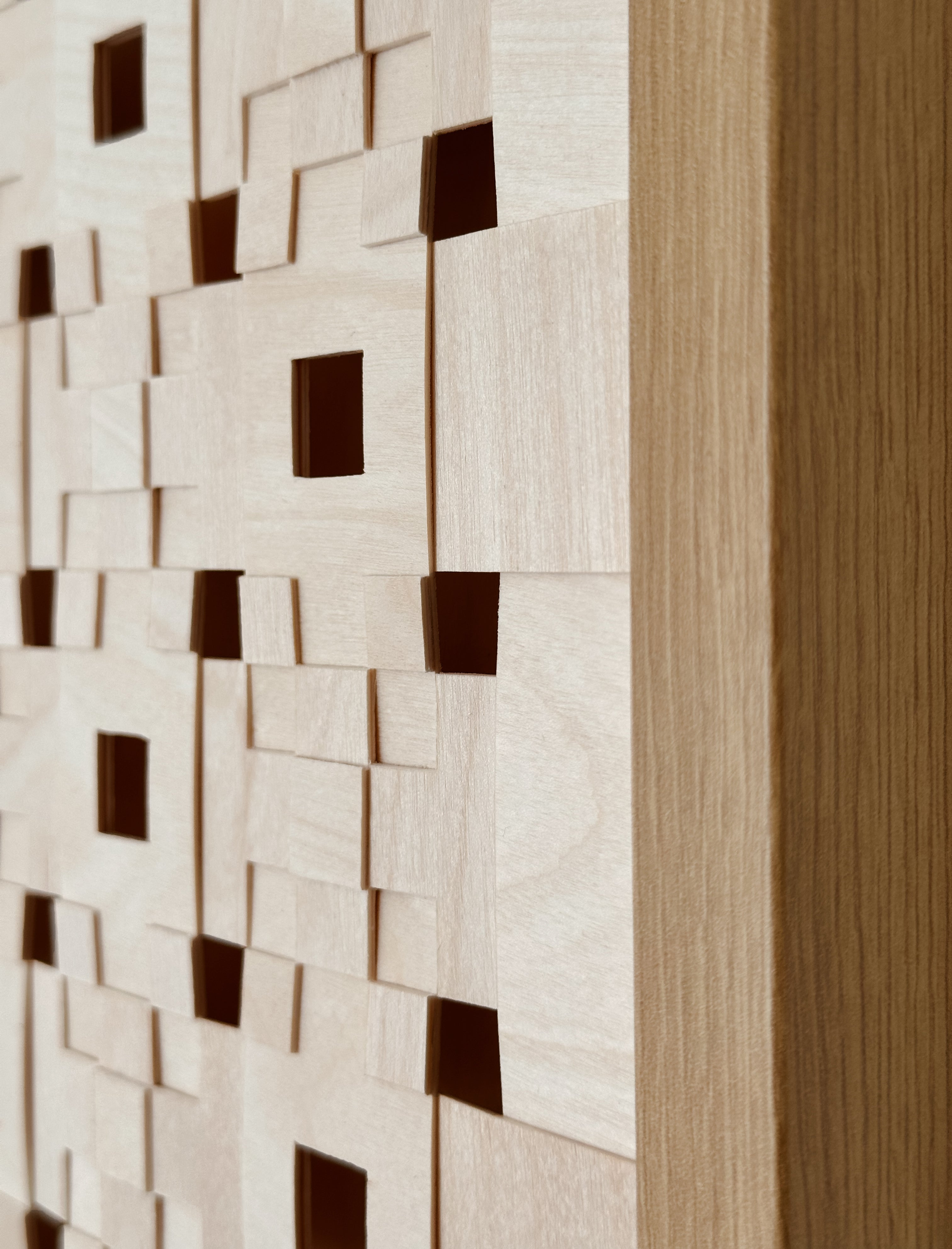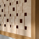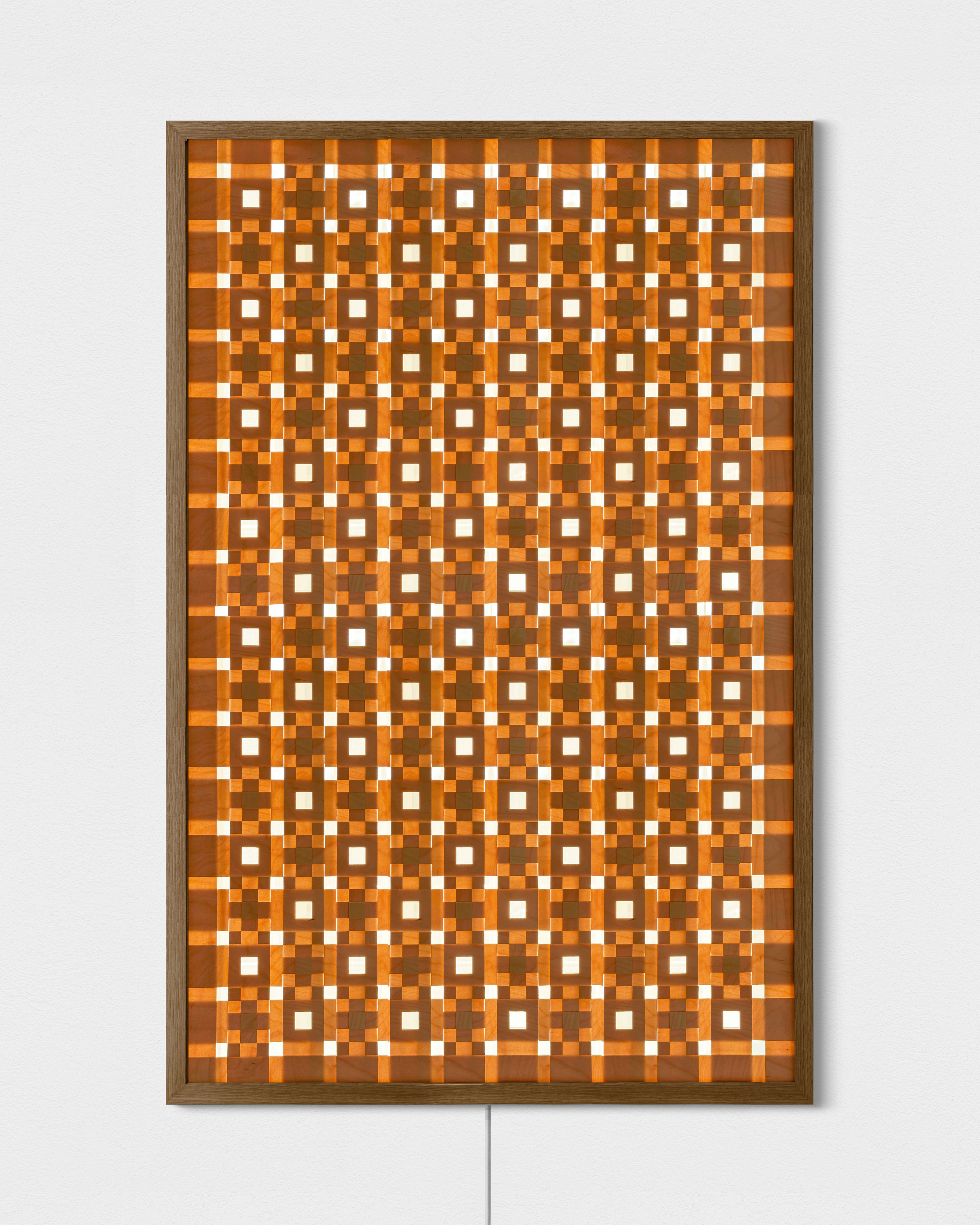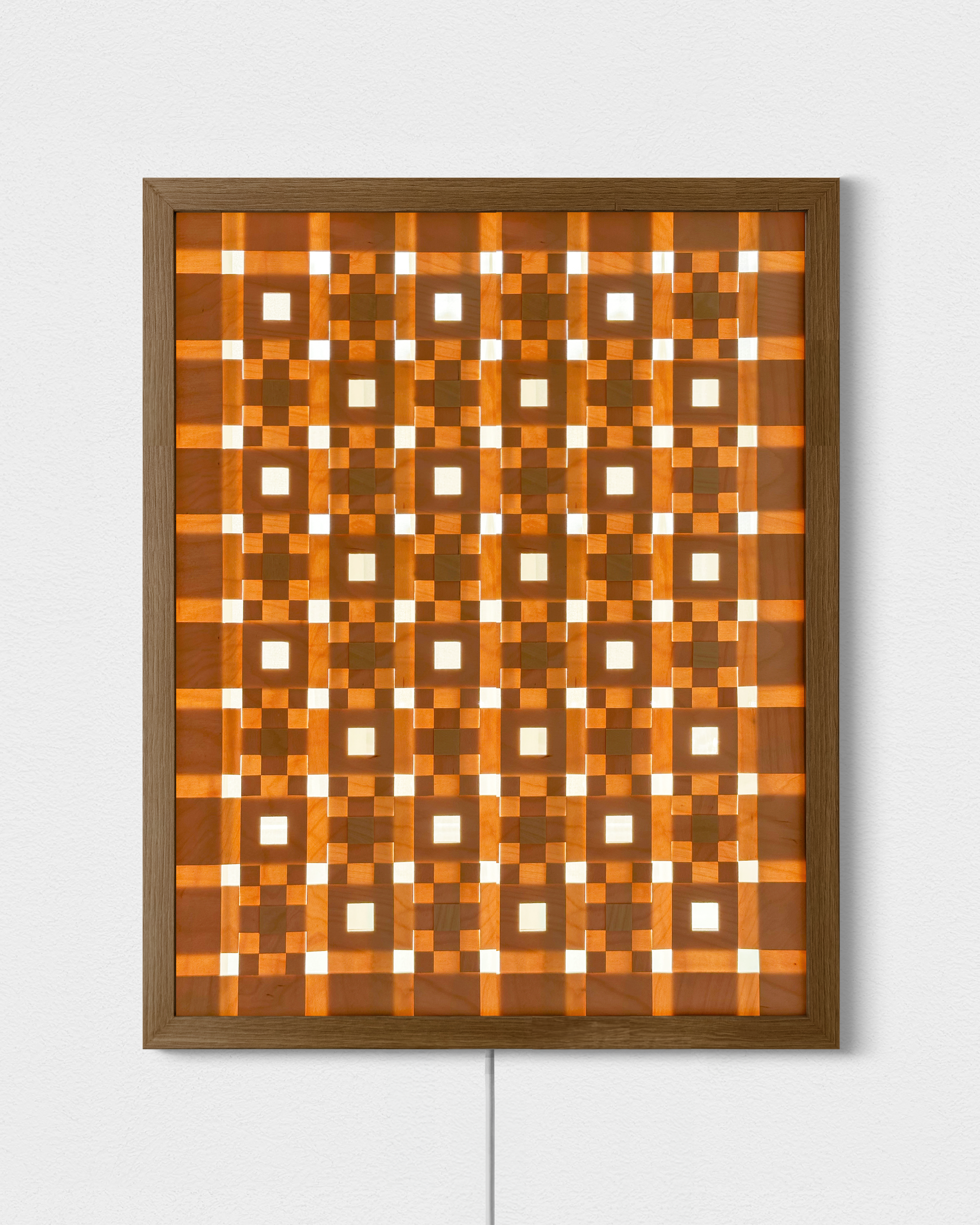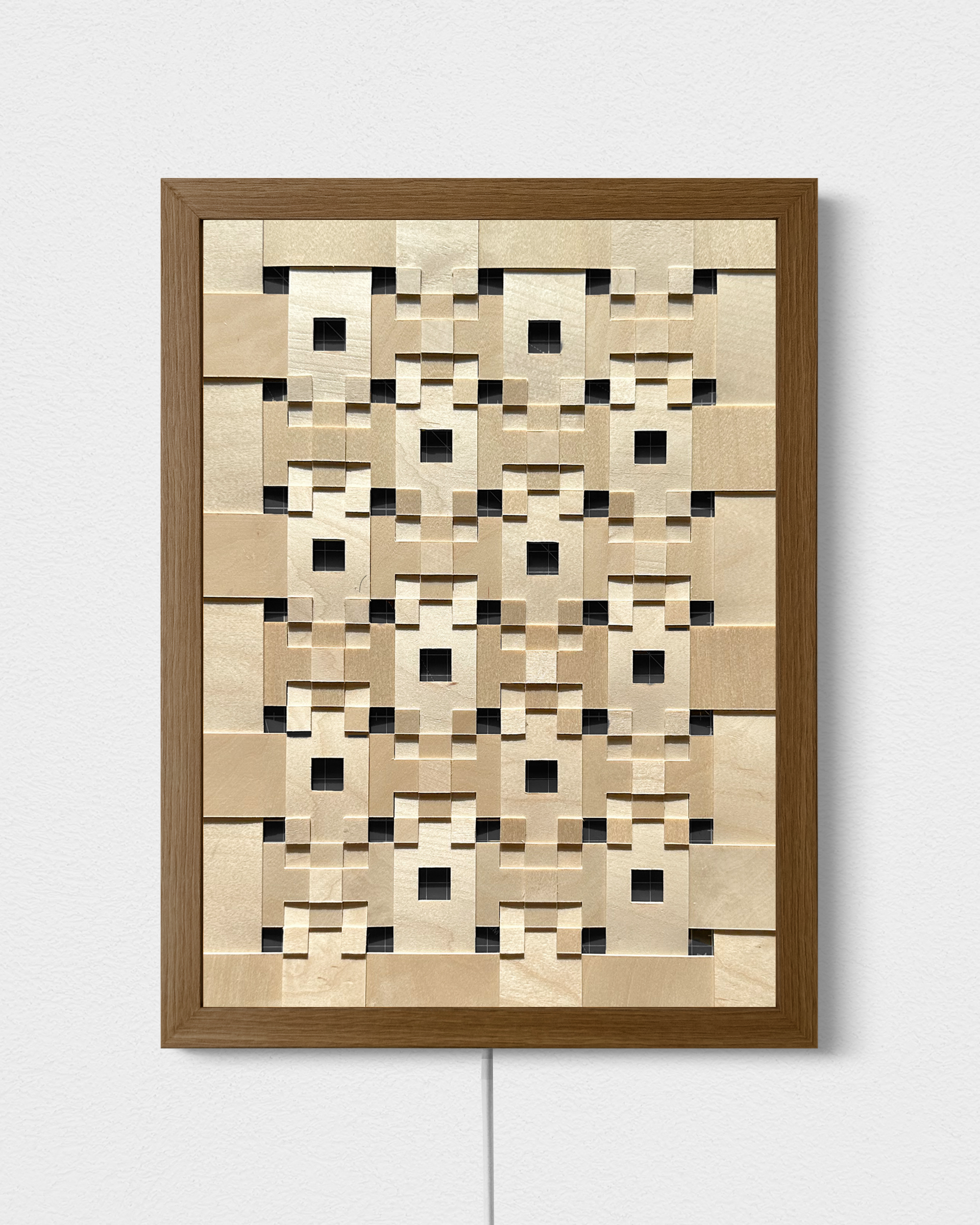 A soft LED light behind the panel brings the structure to life, revealing how the wood filters and shapes the glow. The piece stays understated: balanced between craft and clarity, warm material and modern technique. It is designed to offer a calm point of focus, inviting light to become part of the texture rather than something added on top.